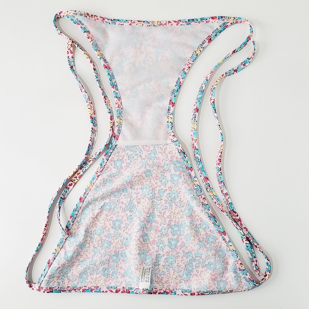 Pink palm tree triangle top matches the thong bottom to make the elegant one set bathing suit.