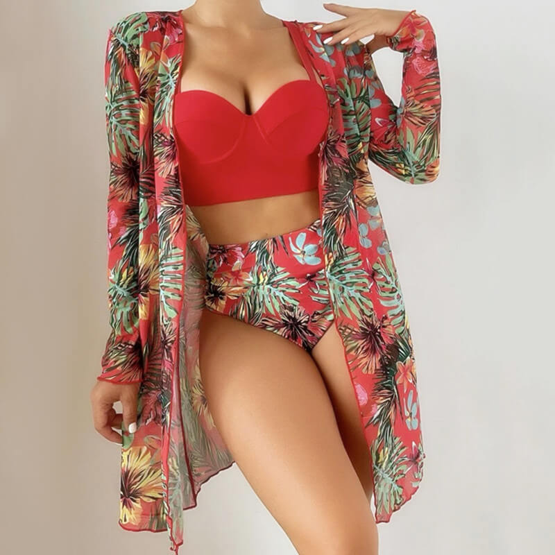 Classic ruffle flroal printing top,bottom and cover up to make this elegant classic charming three piece women swimming suit.