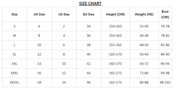 | Size | UK Size | US Size | EU Size | Height (CM) | Weight (KG) | Bust (CM) |