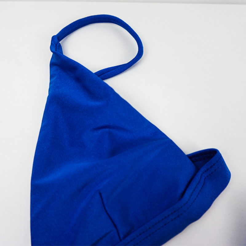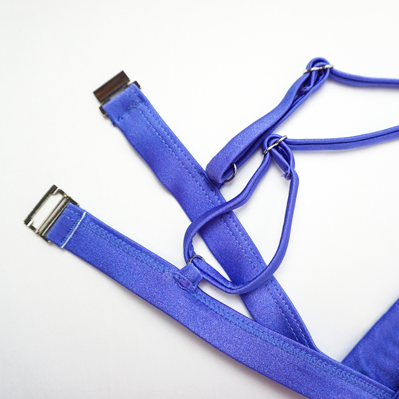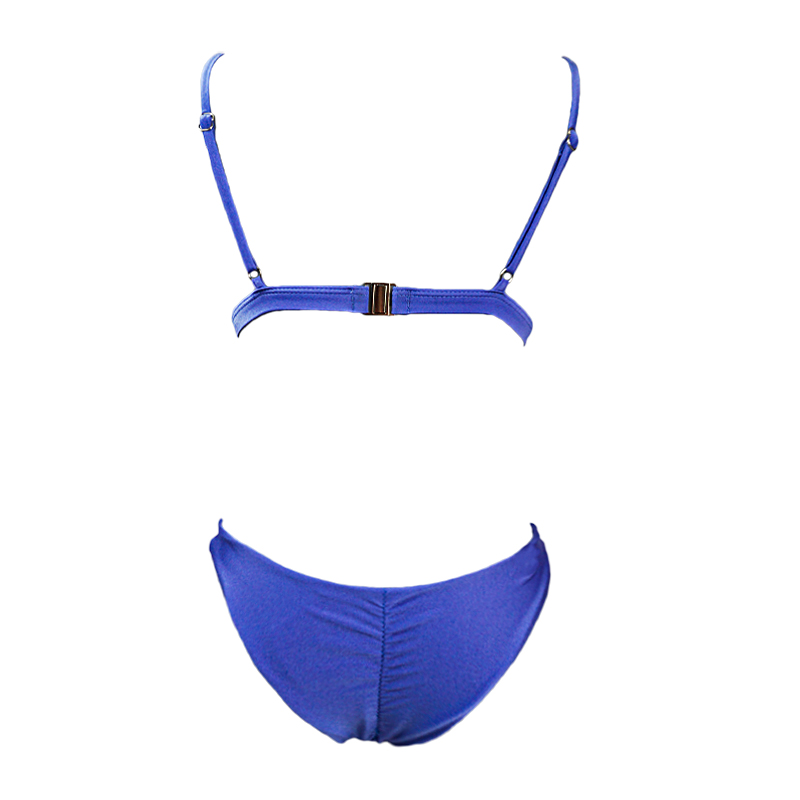 blue back buckle adjustable strap top and triangle ruched bottom