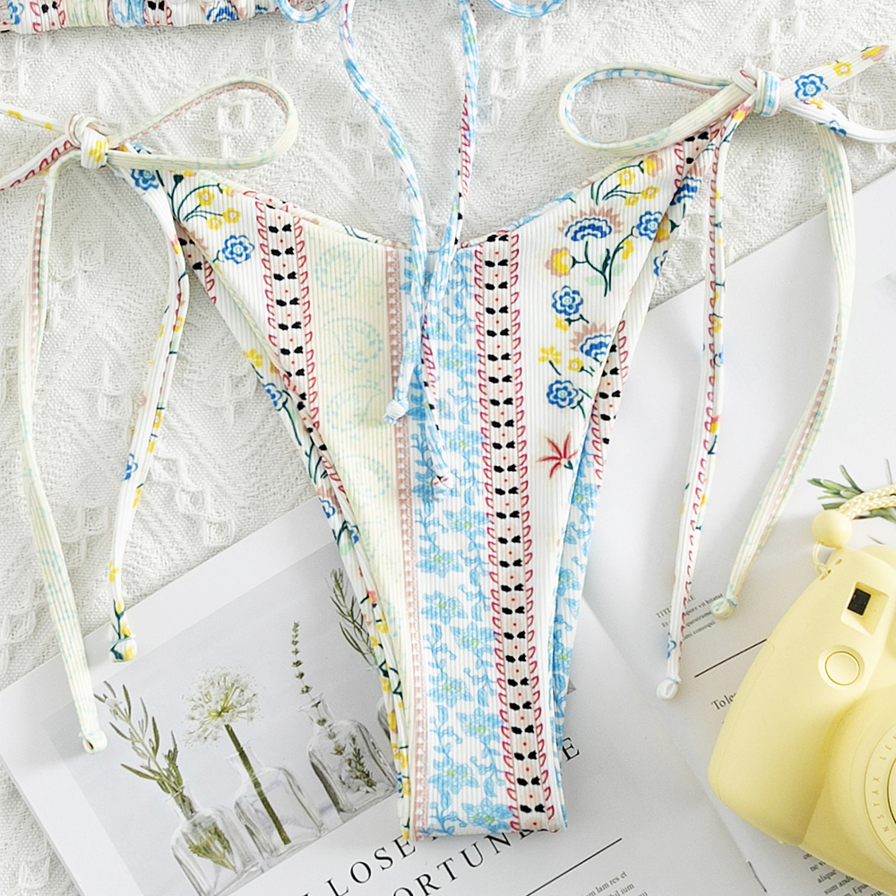 The stylish two-piece bikini set features a Paisley bikini swim top with drawstring tie at front, detachable padded cups, paired with a pair of cheeky bikini bottoms and side tie-tie. All over in a patch flower pattern.